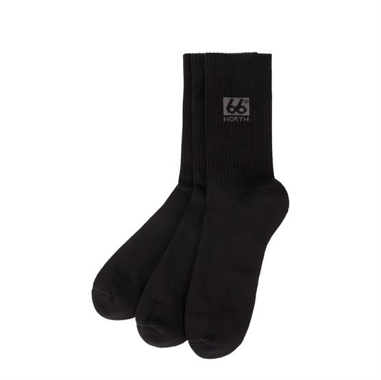 En enkel og praktisk 3-pak sorte bomuldssokker med 66°North logo – perfekte som hverdagsbasis til arbejde, fritid og rejser, hvor komfort og en god pasform betyder mest.