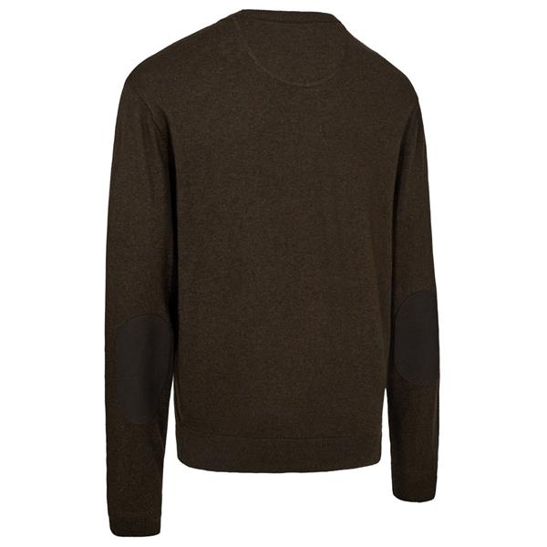 Stoffet er strikket i en kombination af 50% Merinould og 50% Bomuld, som gør at du får en let og samtidig slidstærk kvalitet, der stadig har uldens isolerende, svedtransporterende og antibakterielle egenskaber. Trøjen er med rund hals og kontrast strikkede albuepatches. Kraven har en smal ribkant, og så er der brede strikkede ribkanter i afslutningen er ærmerne og omkring livet.