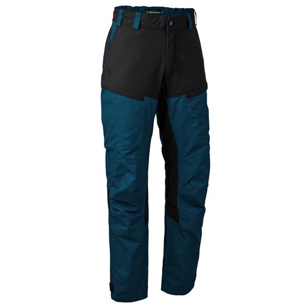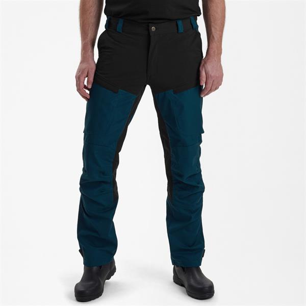 Deerhunter Strike Trousers er konstrueret med en gennemtænkt kombination af slidstærke materialer og strategisk placerede stretchzoner. Yderstoffet i polyester og bomuld giver en god balance mellem holdbarhed og åndbarhed, mens kontrastpanelerne med