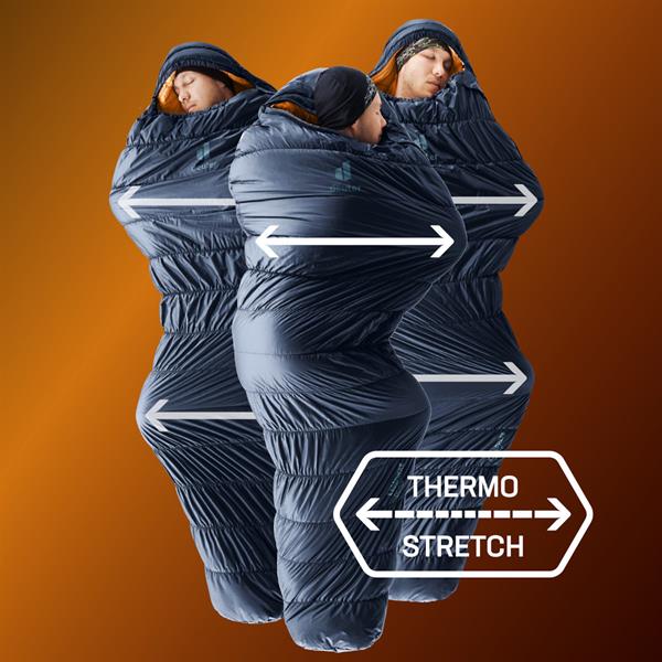 ThermoStretch syninger, som gør, at den kan give sig, når du vender dig i løbet af natten. Det giver en mere naturlig sovestilling og mindre fastlåst fornemmelse – samtidig med at soveposen stadig slutter tæt nok til at holde effektivt på varmen, når kulden bider.