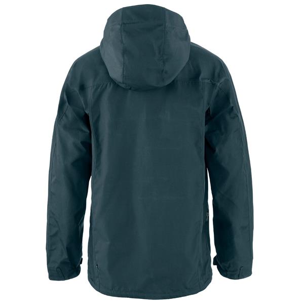 vandrerygsæk med bredt hoftebælte på. Hætten er justerbar så du kan få den til at sidde godt til om hovedet, og stor nok til at den kan komme ud over en hjelm. Ærmerne kan justeres ind med trykknapper om håndleddet, og så kan du justere livet til med en træksnor, så du slutter tæt til nedefra. Ryggen er også lavet lidt længere, så jakken bedre dækker den kolde plet på lænden, når du bukker dig eller strækker kroppen.