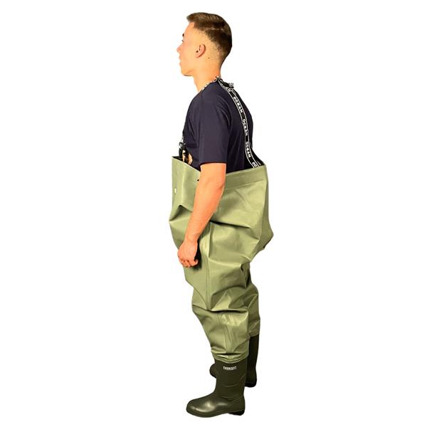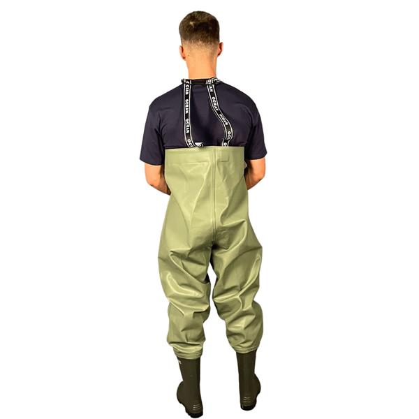 Materialet er lavet til at holde til hårdt brug og er samtidig modstandsdygtigt overfor fedt og olie, hvilket gør den ekstra robust til krævende forhold. De integrerede gummistøvler giver solid beskyttelse og gør det nemt at komme hurtigt i gang ved vandet, mens de elastiske seler med