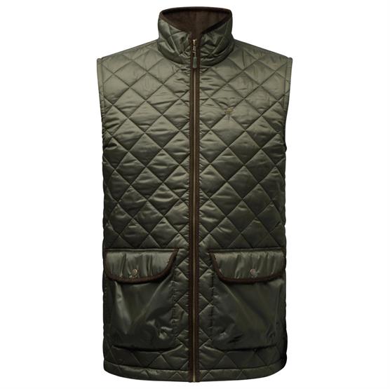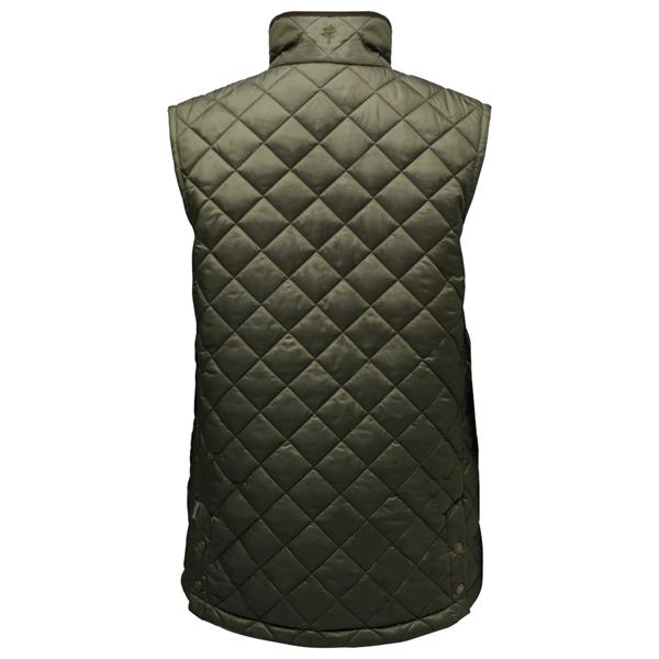 Stoffet er lavet med 100% PFC-fri vandafvisende finish, så vandet preller bedre af på overfladen, i stedet for at trænge direkte ind i materialet, så vesten bliver fugtig og kold. Vesten er også justerbar i livet, så du kan få en flot og tætsluttende pasform. Vesten har en quiltet fiberforing, høj krave der når op og dækker omkring halsen, og gode håndlommer hvor der er plads til ammunition eller andet jagt- og outdoor udstyr, samt en lynlås lukket inderlomme.