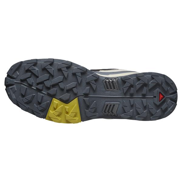 Ydersålen er lavet i All-Terrain Contagrip gummi, der giver et sikkert greb på både våde rødder, grus, klipper og hårdt pakket skovsti. Mønsteret er designet til at give stabilt fodfæste, hvad enten du går opad, nedad eller tværs over skrånende terræn, så du kan føle dig tryg på skiftende underlag. Med Salomons QuickLace system får du desuden en hurtig og præcis tilpasning, hvor snørerne låses i en lille lomme øverst på pløsen, så du undgår løse ender og snørebånd, der hænger og generer eller griber fast i grene og blade.
