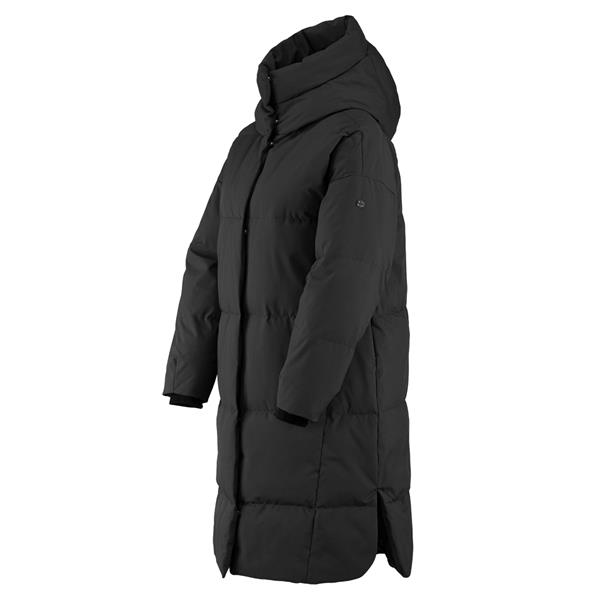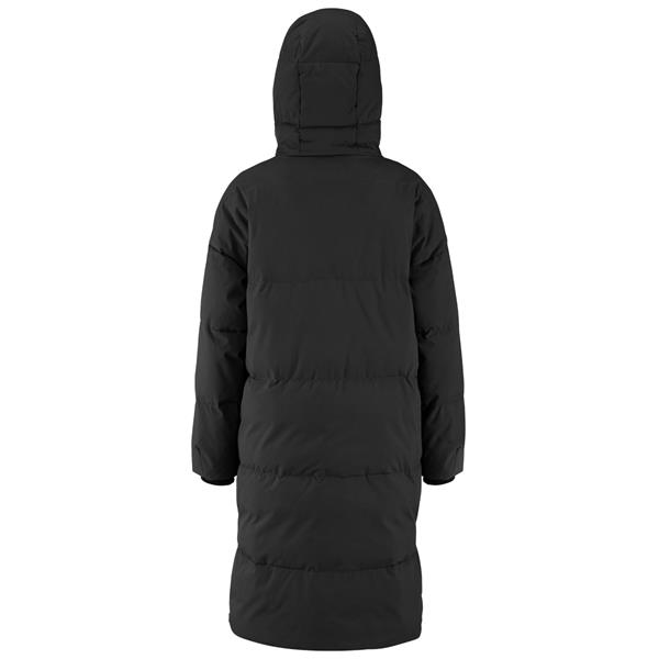 Vinterjakken har en høj krave med en fastmonteret og dunforet hætte, der holder kulden væk fra ansigtet. Foruden at have en flot feminin silhuet, holder den lange parkalængde også rigtig godt på varmen og forhindrer kulden i at slippe op nedefra. I bunden af jakken har den pull-down reflekser til dine gåture i dårlig sigtbarhed eller på de sene vinteraftener.