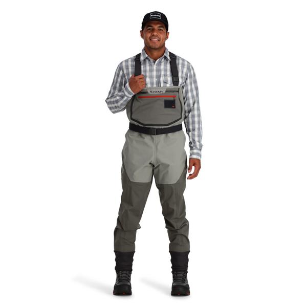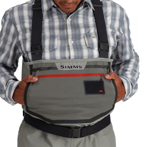 På overkroppen er wadersne udstyret med en praktisk lommeopsætning, hvor du finder en rummelig brystlomme med stræk, mikro-fleeceforede håndvarmerlommer og en integreret fluepatch. Elastiske seler med Simms’ karakteristiske spænder gør det nemt at justere pasformen eller konvertere wadersne til taljehøjde, når temperaturen stiger.
