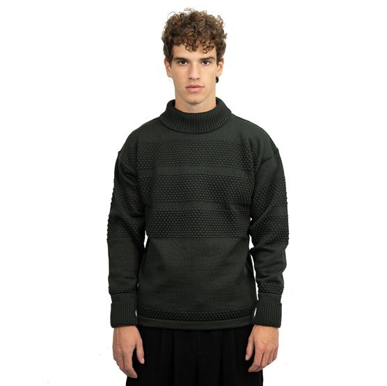 Sweateren er strikket i 100% ren uld, med de karakteristiske knopper, som fanger luft mellem fibrene og skaber naturlig isolering. Ulden regulerer varmen og leder fugt væk fra kroppen, så du forbliver komfortabel – også ved fysisk aktivitet i koldt vejr. Den høje rullekrave beskytter hals og nakke mod træk, mens de brede ribkanter i ærmer og bund lukker kulden ude og sikrer en behagelig pasform.